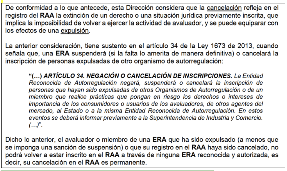 Finalmente, se recuerda a los interesados que en atención a la interpretación de dicha Superintendencia ha realizado frente a los efectos propios de la sanción disciplinaria de cancelación de la inscripción en el RAA, la misma constituye una limitante permanente y vitalicia para actuar como avaluador, tal y como se puede evidenciar dentro de la comunicación remitida por parte de la SIC a las ERA y que se referencia a continuación: